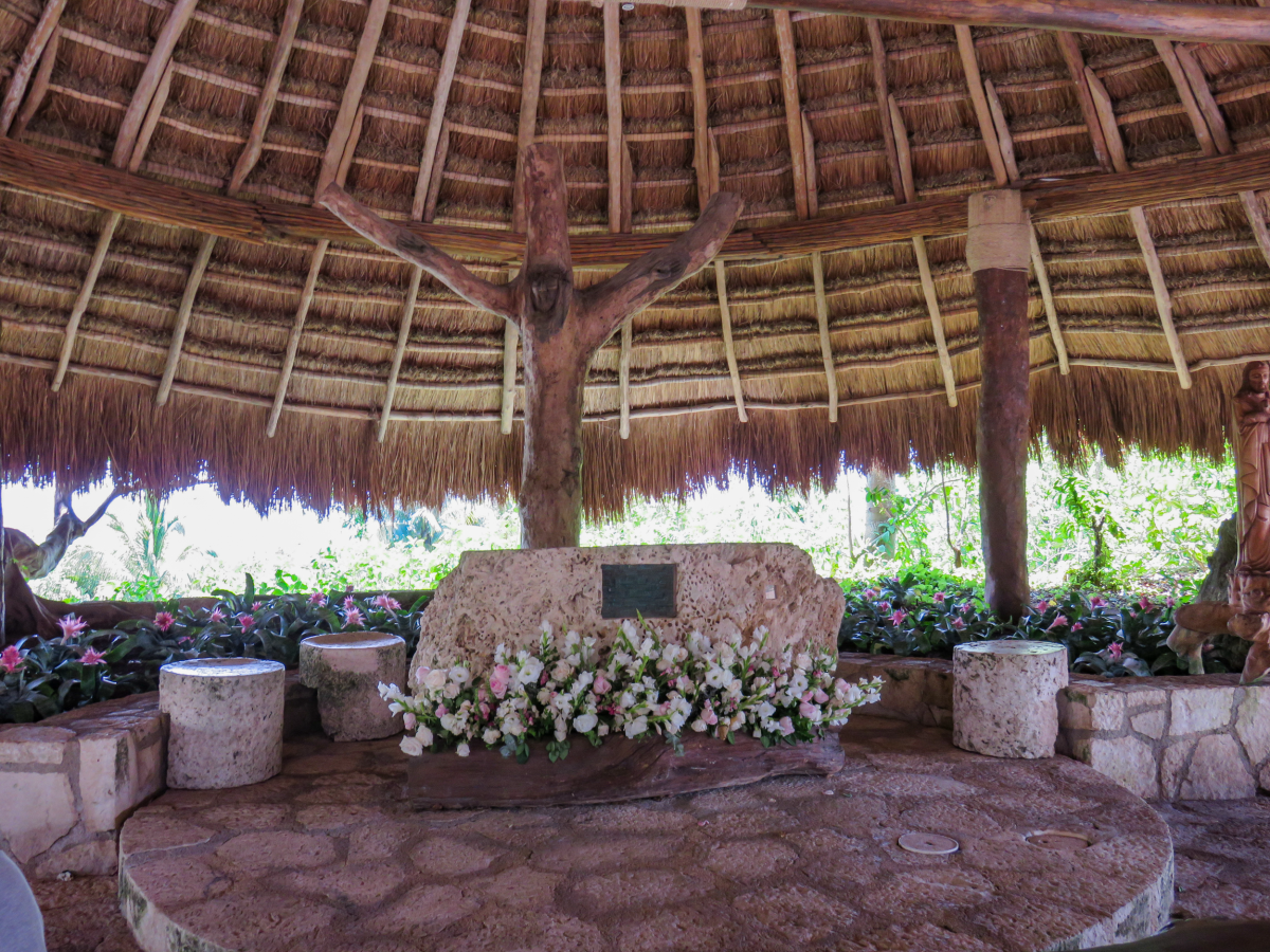 This chapel dedicated to St. Francis of Assisi, protector of nature and animals, was built integrating natural Mayan elements, such as the living tree at the entrance, the cross carved in a chicozapote tree, the limestone altar, and its salam wood pews.